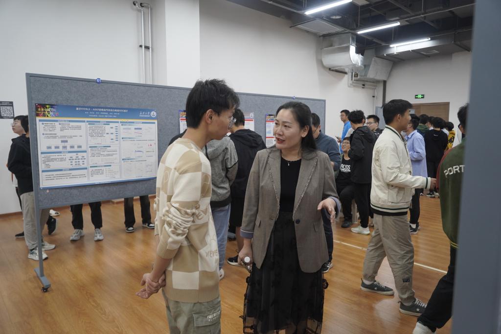 其他年级同学分批次集中观展,担任大众评审,分别从海报内容创新性、完整性,海报设计展示及海报解说5个方面进行线上打分,观展同学纷纷借此机会与现场学长学姐一同交流探讨,学习海报创作技巧和课题研究思路的同时,也对不同专业科研方向有了清晰的认识,同学们参与热情高涨,现场气氛热烈。